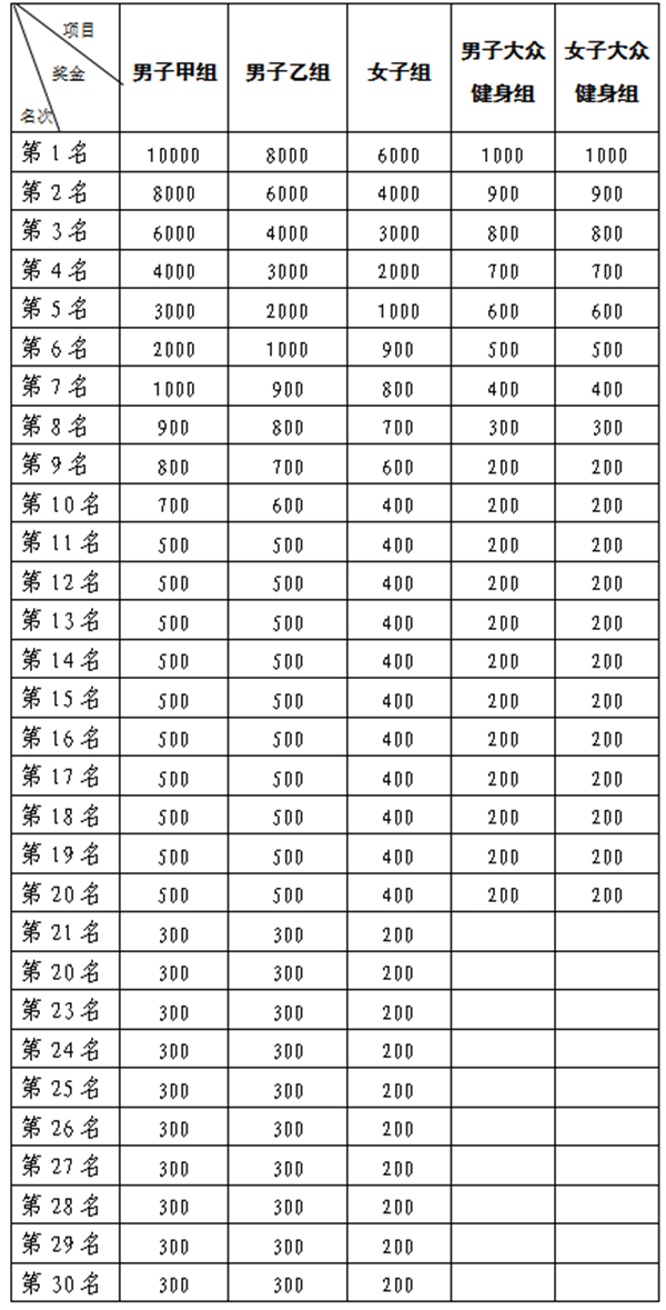 1、本赛事将对男子甲组、男子乙组、女子组前30名参赛运动员给予相应的奖金奖励,对男子大众健身组、女子大众健身组前20名参赛运动员给予相应的奖金奖励。参赛人数不足50人(含50人,以检录人数为准)录取名次及奖金额度适当调整。