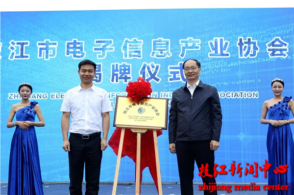 枝江市委书记刘丰雷与枝江电子信息产业协会会长、湖北华鑫光电有限公司总经理杜冯林共同为枝江市电子信息产业协会揭牌