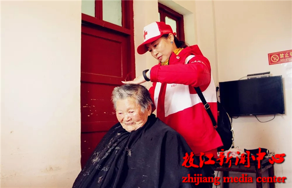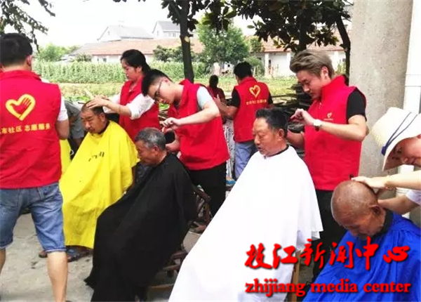 6月14日,董市社区居委会工作人员刚到董市镇福利院就看到身穿“红马甲”的志愿者已经在院子里热热闹闹的给老人们理发了。他们一边为老人理发,一边与老人唠家常,每位老人脸上都露出无比开心的笑容。